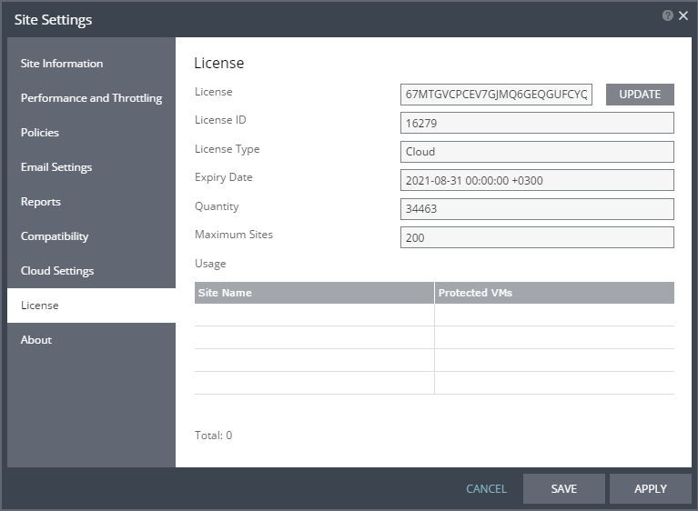 ■ Usage – The sites using the license and number of protected virtual machines in each site. The number of virtual machines is independent of whether they are in vApps or not.