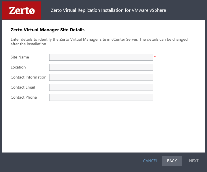 ■ Site Name: A name to identify the site. This name is displayed in the Zerto User Interface. This field is mandatory.