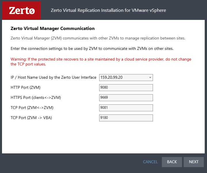 IP/Host Name Used by the Zerto User Interface | NA | | Zerto User Interface - and - Zerto Virtual Manager | IP to access the Zerto Virtual Manager from the Zerto User Interface. If the machine has more than one NIC, select the appropriate IP from the list. Otherwise, the IP that is displayed is the only option. |