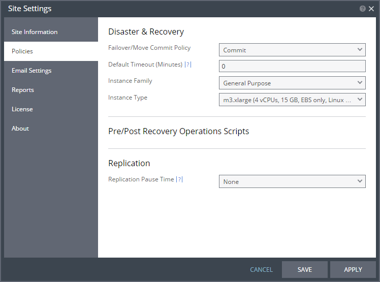 The Site Settings dialog enables configuring various site settings. These include the maximum bandwidth that Zerto Virtual Replication uses between the protected and recovery sites, default script timeout, and protection policies such as the commit policy for a failover or move operation.