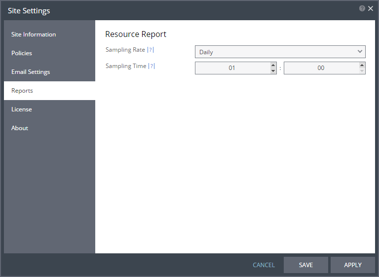 Specify when you want to take resource samples to identify resource usage, either daily at a specific hour and minute or hourly at a specific minute within each hour.
