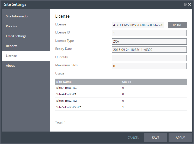 The Zerto license includes information such as the number of virtual machines that can be protected and the license expiry date. You can see these details in the Site Settings > License dialog.