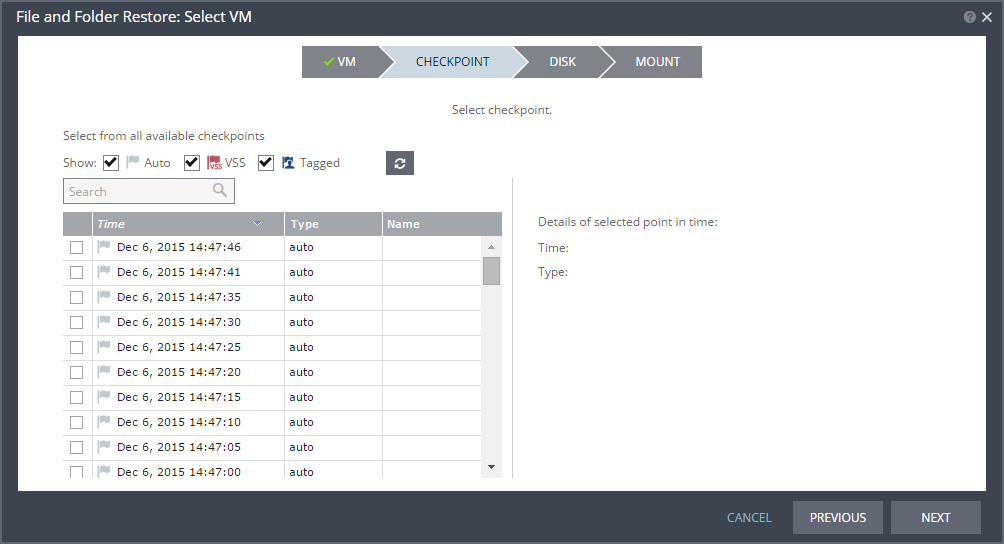 ■ VSS: Checkpoints that were synchronized with VSS snapshots are displayed. When VSS is used, recovery to the latest VSS snapshot ensures that the data is both crash‑consistent and application consistent to this point. The frequency of VSS snapshots determines how much data can be recovered.