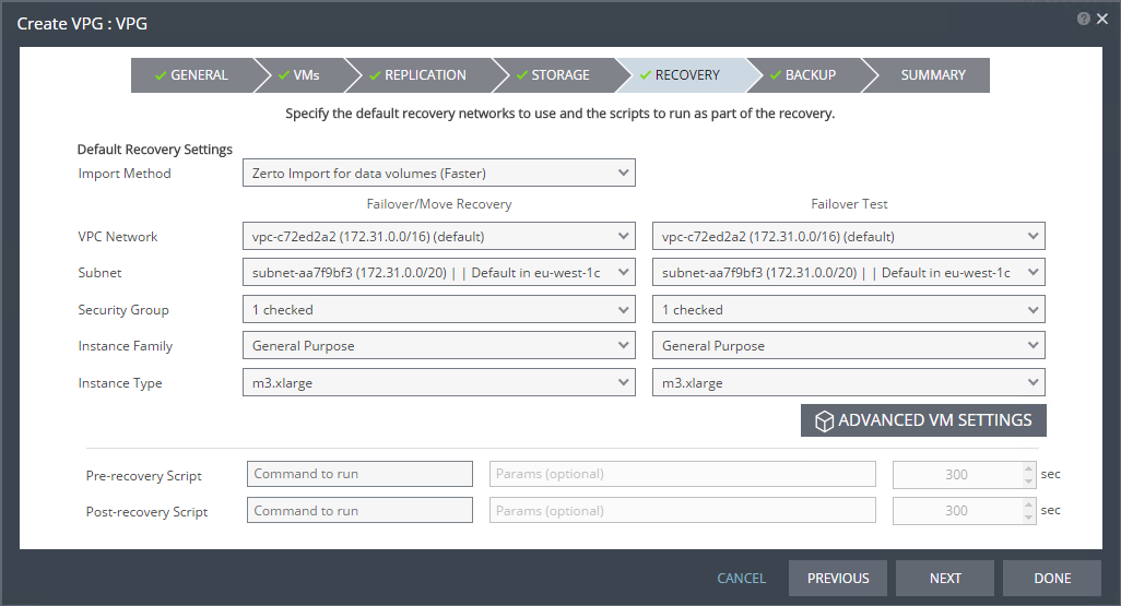 When specifying scripts in the definition of a VPG, enter values for the Pre-recovery Script and Post-recovery Script: