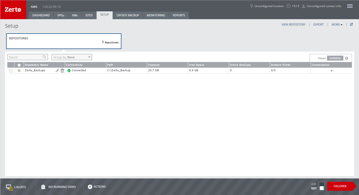 View details of the repositories that can be used for offsite backup jobs in the REPOSITORIES subtab, under the SETUP tab. This tab lists all the repositories created for the site.