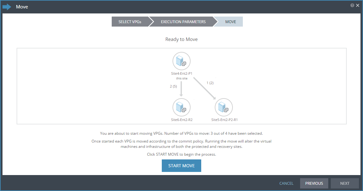 The MOVE step is displayed. The topology shows the number of VPGs and virtual machines being moved to each peer site. In the following example, 2 VPGs will be moved to Site6-Ent2-R2, and they contain 5 virtual machines; and 1 VPG will be moved to Site5-Ent2-P2-R2 and it contains 2 virtual machines.