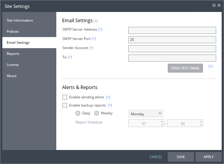SEND TEST EMAIL button – Tests that the email notification is set up correctly. A test email is sent to the email address specified in the To field.
