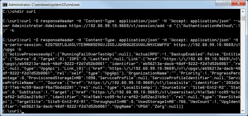 The fourth line contains the value of x-zerto-session, which is used in all subsequent calls.