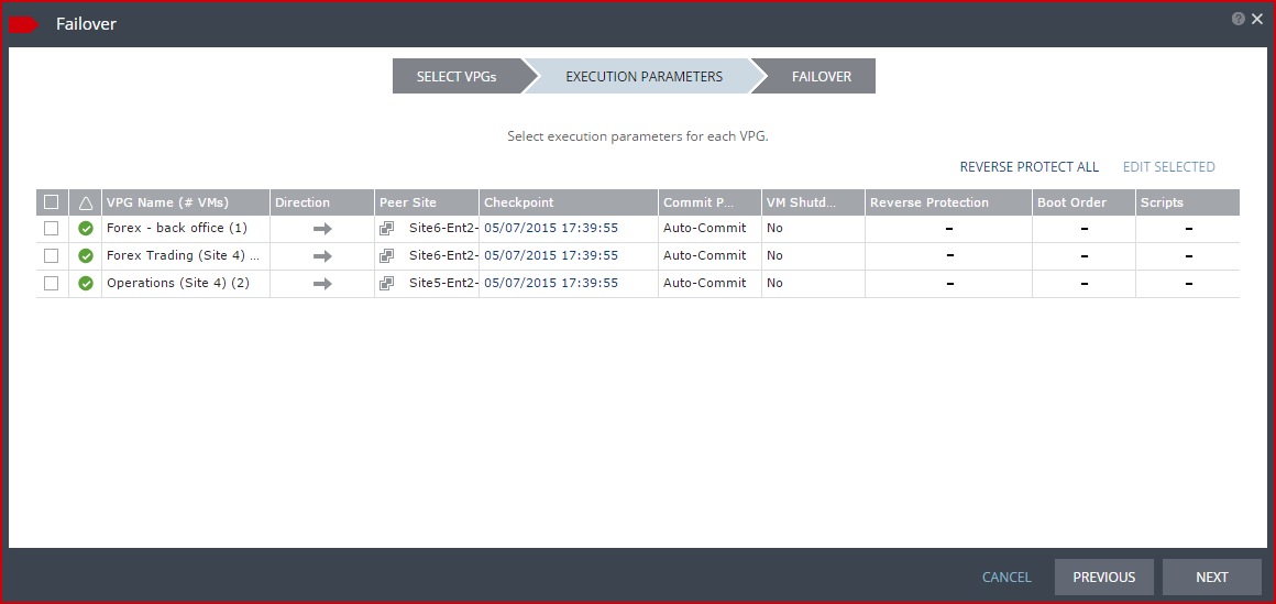 2. Select the VPGs to failover. By default, all VPGs are listed.