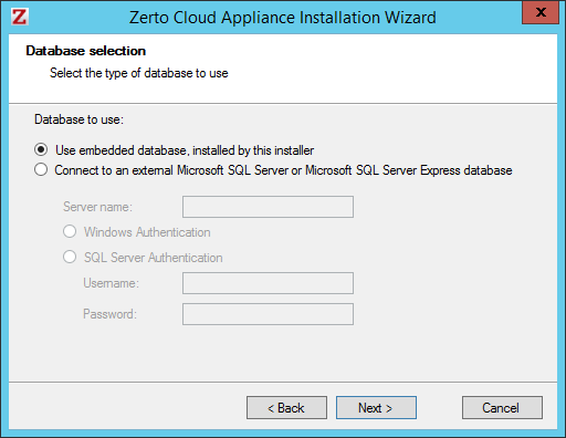 Windows Authentication – Use Windows authentication. This option is only enabled if a specific service user account was specified in the previous Service User dialog, in which case the service account name and password are used.