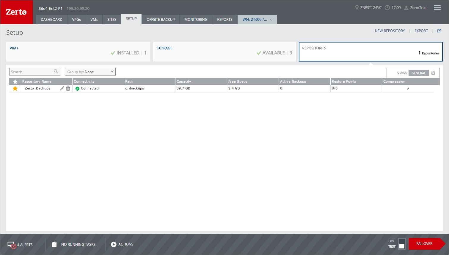 View details of the repositories that can be used for offsite backup jobs in the REPOSITORIES subtab, under the SETUP tab. This tab lists all the repositories created for the site.