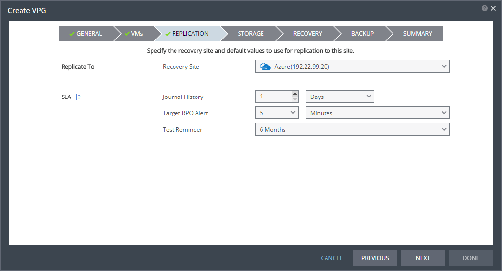 Note: Steps that do not require input are marked with a check mark. You can jump directly to a step that has been marked with a check mark to edit the values for that step. Every step must be marked with a check mark before you can click DONE to create the VPG.