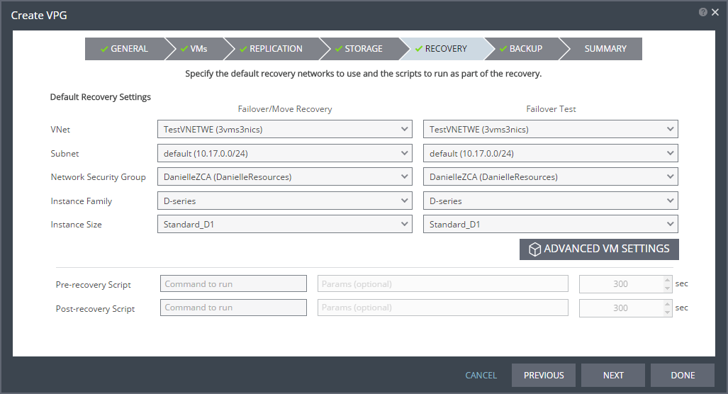 The RECOVERY step is displayed. Recovery details include the networks, network security group, instance family, and instance size to use for failover, move, and testing failover, and whether scripts should run as part of the recovery process.