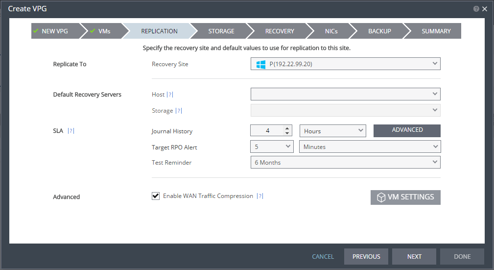 9. If you want to change the replication settings per virtual machine, click VM SETTINGS.