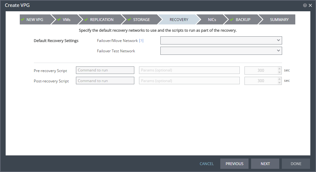 Note: Steps that do not require input are marked with a check mark. You can jump directly to a step that has been marked with a check mark to edit the values for that step. Every step must be marked with a check mark before you can click DONE to create the VPG.