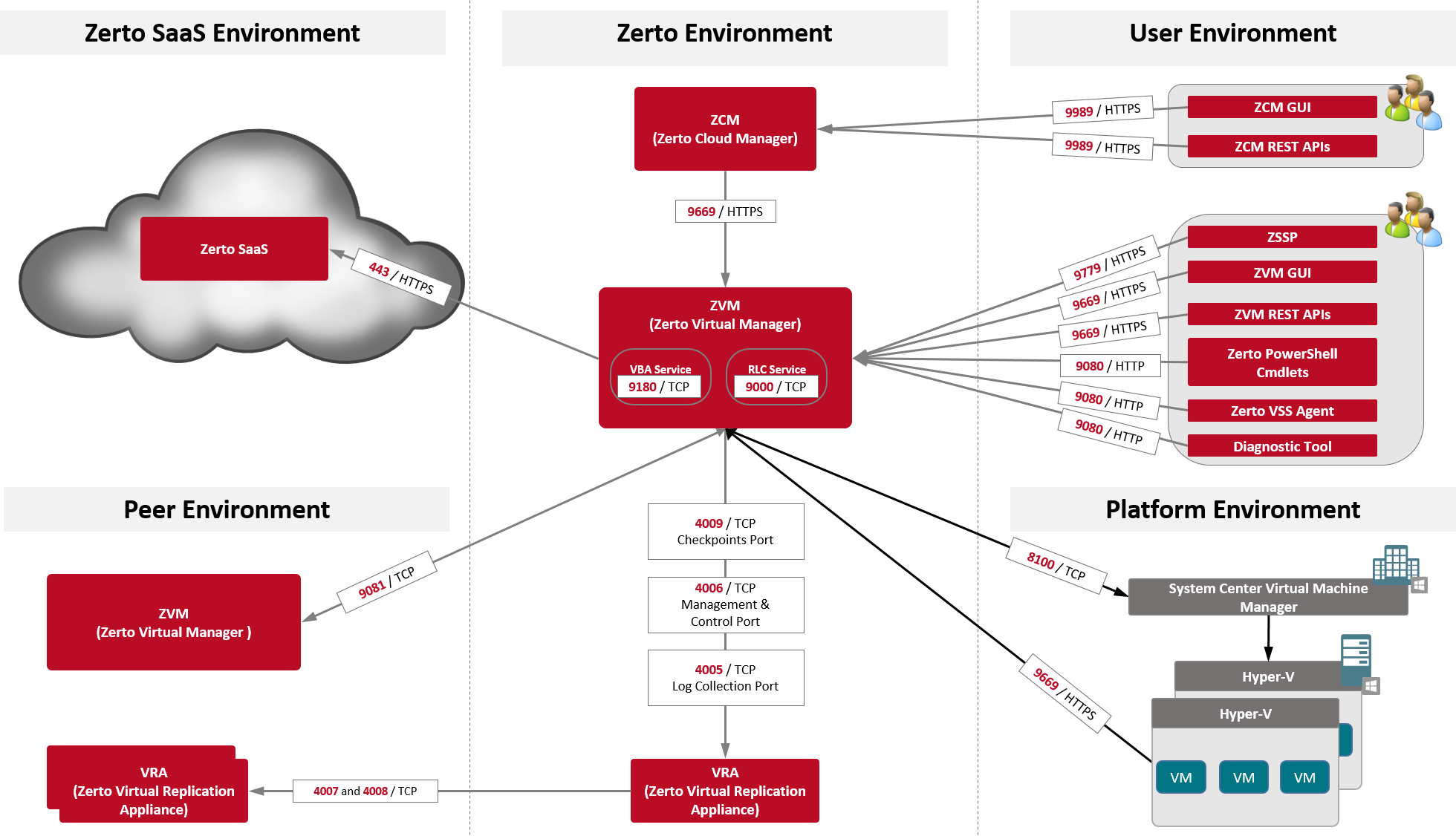 9669* | Communication between ZVM and ZVM GUI and ZVM REST APIs, and the ZCM. Communication between every Hyper-V host and the Zerto Virtual Manager. |
