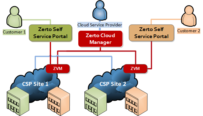 As can be seen in the above diagram, each site has a Zerto Virtual Manager installed, and one Zerto Cloud Manager manages all the sites.