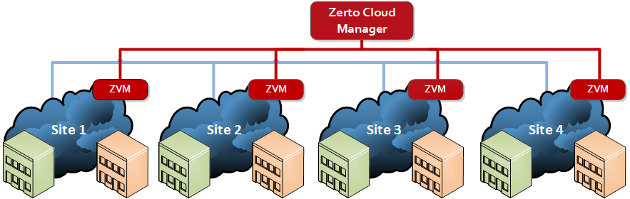 As can be seen in the diagram above, each site has a ZVM installed. One site has the Zerto Cloud Manager installed to manage all the sites.