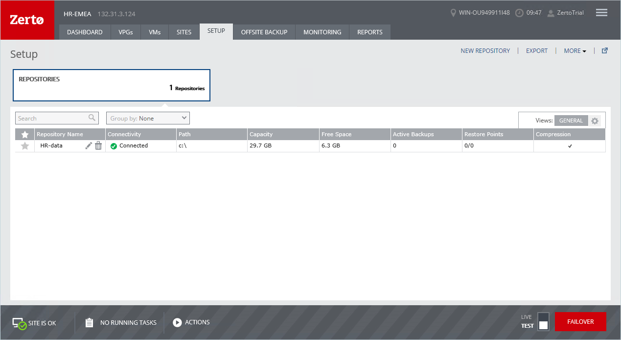 1. In the Zerto User Interface, click SETUP > REPOSITORIES.