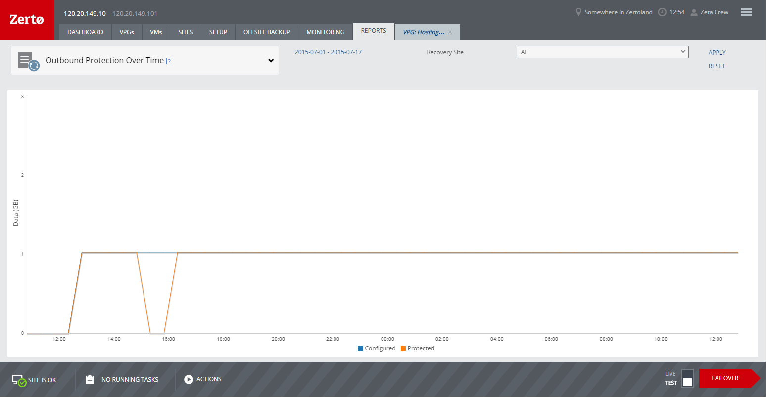 Information about how much data is actually being protected against the amount configured for any of the sites can be displayed in the Outbound Protection Over Time report under the REPORTS tab.