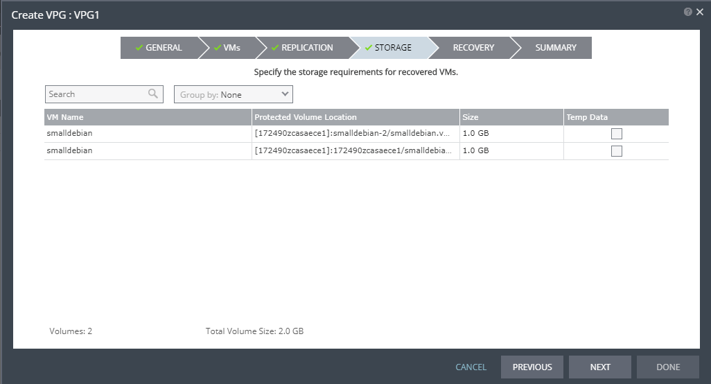 Note: Steps that do not require input are marked with a check mark. You can jump directly to a step that has been marked with a check mark to edit the values for that step. Every step must be marked with a check mark before you can click DONE to create the VPG.