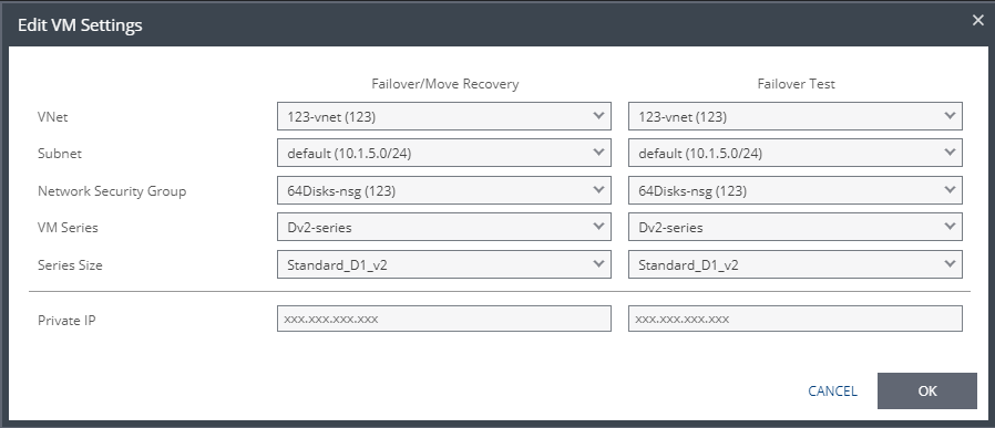 Clearing the values in the Private IP field results in an IP being automatically assigned from the subnet range during a recovery operation.