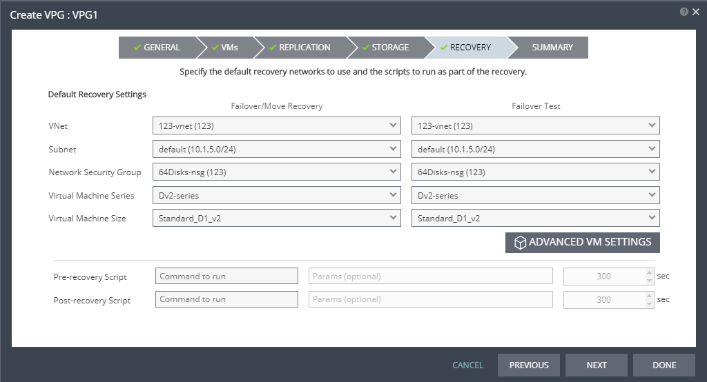 The RECOVERY step is displayed. Recovery details include the networks, network security group, instance family, and instance size to use for failover, move, and testing failover, and whether scripts should run as part of the recovery process.