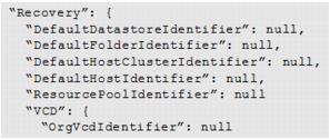 "Recovery": { “DefaultDatastoreClusterIdentifier”: "String Content", "DefaultDatastoreIdentifier": "String Content", "DefaultFolderIdentifier": "String Content", "DefaultHostClusterIdentifier": "String Content", "DefaultHostIdentifier": "String Content", "ResourcePoolIdentifier": "String Content" "VCD": { "OrgVcdIdentifier": "String Content" } }, |