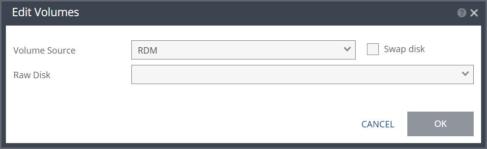 Raw Disk – The VMware RDM (Raw Device Mapping) to use for the replication: By default, RDM is recovered as thin-provisioned VMDK in the datastore specified in the VM Recovery Datastore field in the Edit VM dialog, and not to RDM. You cannot define an RDM disk if the virtual machine uses a BusLogic SCSI controller, nor when protecting or recovering virtual machines in an environment running vCenter Server 5.x with ESX/ESXi version 4.1 hosts. Only a raw disk with the same size as the protected disk can be selected from the list of available raw disks. Other raw disks with different sizes are not available for selection. The RDM is always stored in the recovery datastore used for the virtual machine. The following limitations apply to protecting RDM disks:
