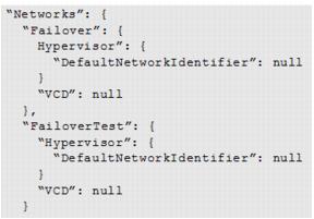 "Networks": { "Failover": { Hypervisor": { "DefaultNetworkIdentifier": "String Content" } "VCD": "String Content" }, "FailoverTest": { "Hypervisor": { "DefaultNetworkIdentifier": "String Content" } "VCD": "String Content" } }, "Protected": { "VCD": { "VCDVappIdentifier": "String Content" } } |