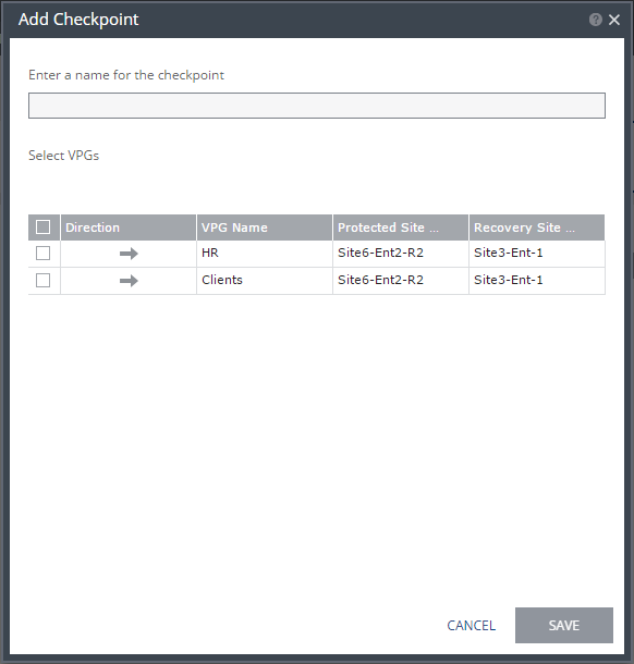 A list of VPGs is displayed with the requested VPG selected. You can select more VPGs to add the same checkpoint to, for example, when something is happening at your site that affects multiple VPGs.