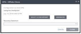 You might want to create a clone if you need to have a copy of the virtual machines saved to a specific point-in-time, for example, when a VPG enters a Replication Paused state, or when testing a VPG in a live DR test.