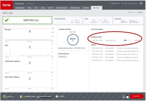 The cloning starts and the status is displayed in the VPG details tab.