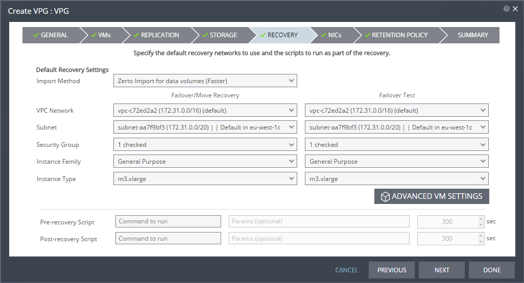 When specifying scripts in the definition of a VPG, enter values for the Pre-recovery Script and Post-recovery Script: