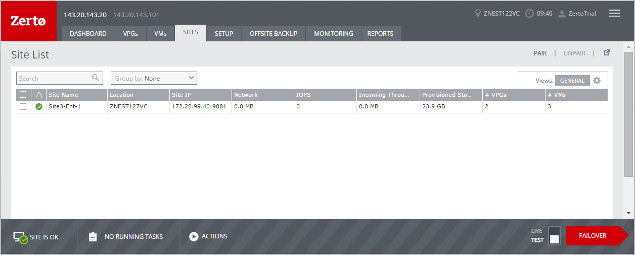 View details of the paired sites in the SITES tab. This tab lists all the sites paired to the local site and provides summary details of each paired site.