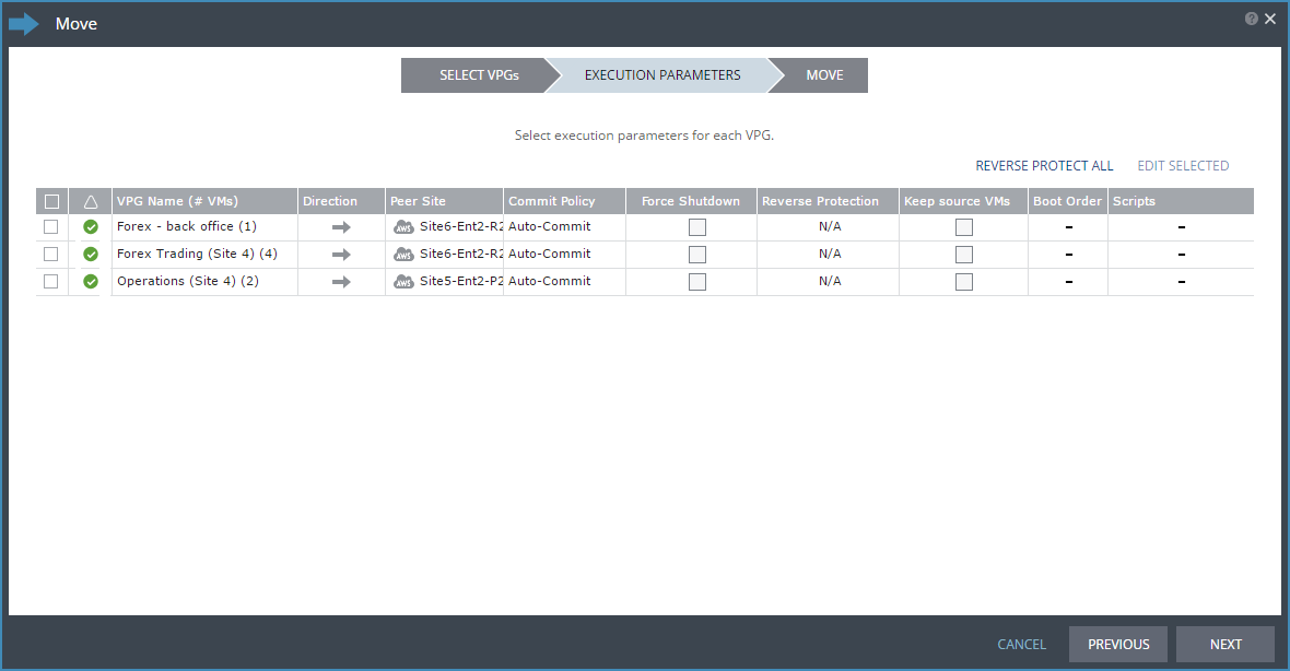 4. To change the commit policy, click on the field or select the VPG and click EDIT SELECTED.