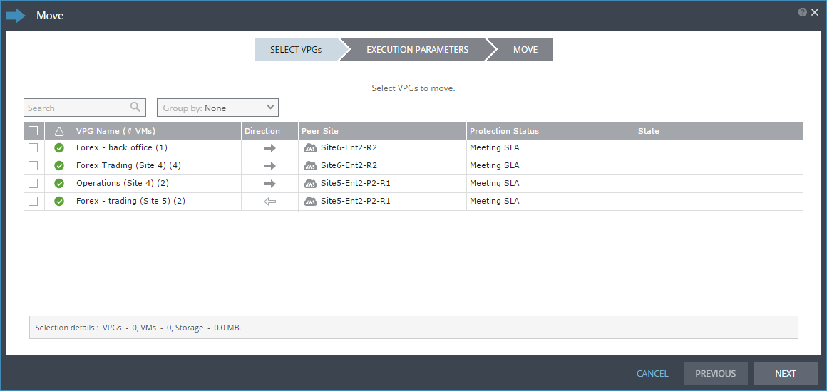 Protecting virtual machines in several VPGs is enabled only if both the protected site and the recovery site, as well as the VRAs installed on these sites, are of version 5.0 and higher.