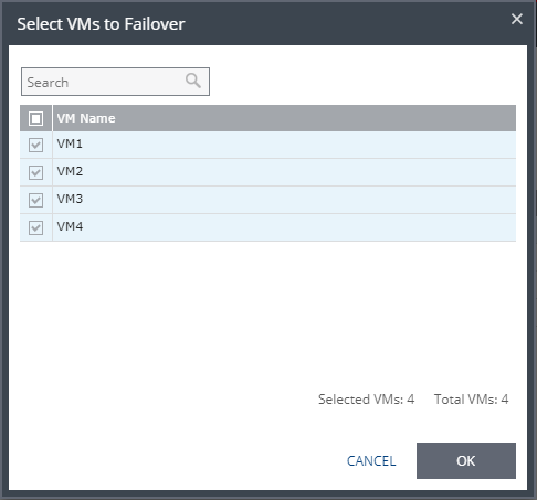a) To select specific VMs in a VPG, click the icon next to each VPG to get a list of VMs. The Select VMs to Failover dialog is displayed. By default, all VMs are selected.