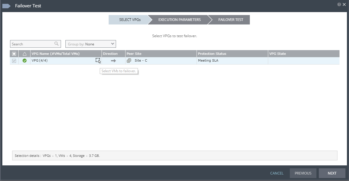 Note: Selecting specific VMs in a VPG to failover is not supported when replicating from a vCD site.