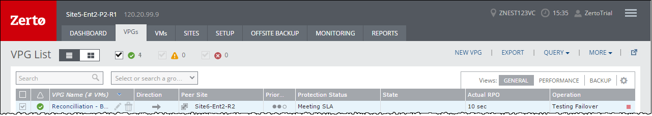 In the Zerto User Interface, click the VPGs tab. The Operation field in the GENERAL view displays Testing Failover when a failover test is being performed.