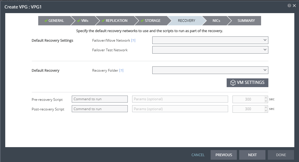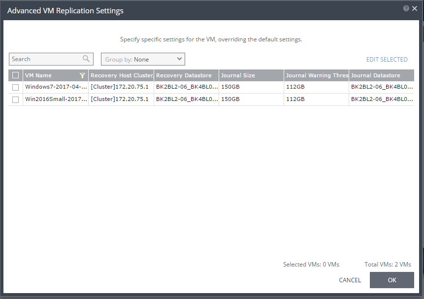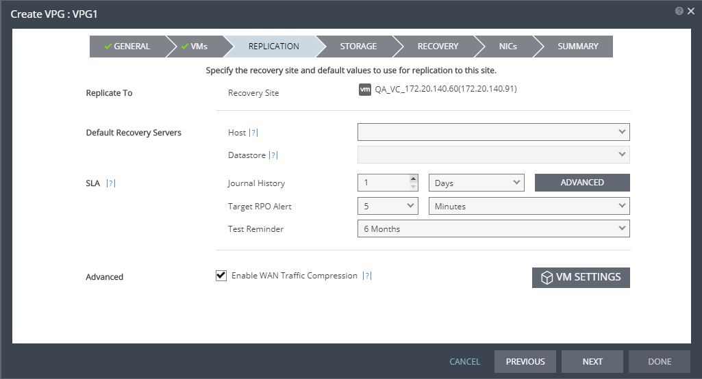 Advanced | VM SETTINGS | To change the replication settings per virtual machine, click VM SETTINGS button, and proceed to step 14. |