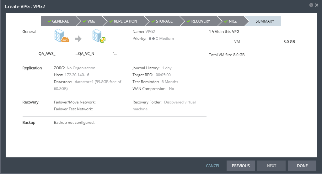 The storage/datastore used for the journal data for each virtual machine in the VPG. | (vSphere) To change the default, specify a host and then select one of the datastores accessible by this host to be used as the journal datastore. When you select specific journal datastore, the journals for each virtual machine in the VPG are stored in this datastore, regardless of where the recovery datastores are for each virtual machine. In this case, all the protected virtual machines must be recovered to hosts that can access the specified journal datastore. (Hyper-V) To change the default, specify a host and then select the storage location accessible by this host to be used as the journal storage. When you select specific journal storage, the journals for each virtual machine in the VPG are stored in this storage, regardless of where the recovery storage is for each virtual machine. In this case, all the protected virtual machines must be recovered to hosts that can access the specified journal storage. |