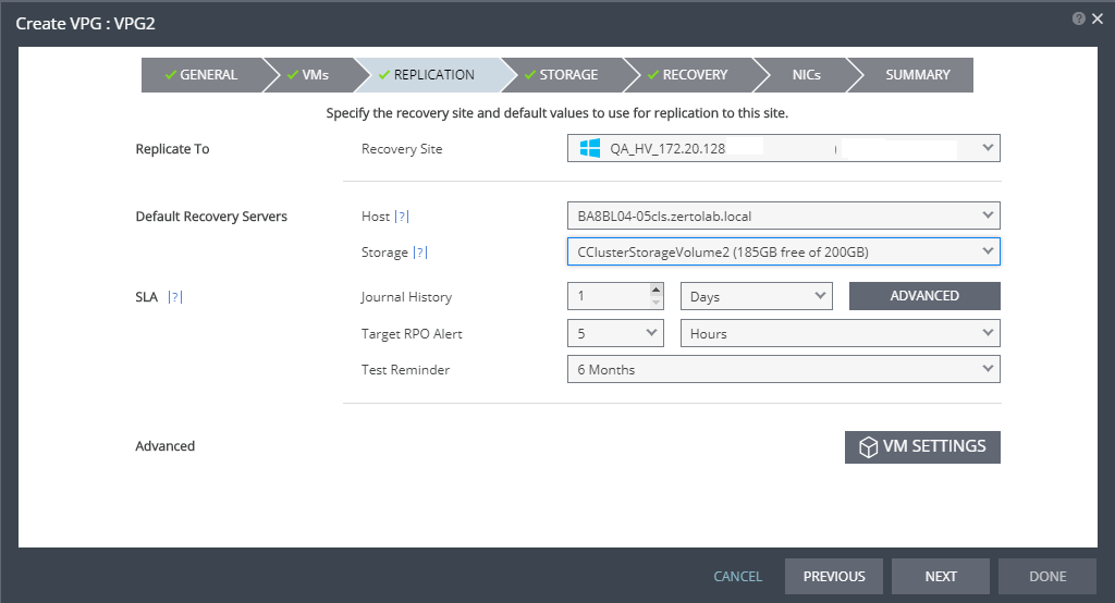 Advanced | VM SETTINGS | To change the replication settings per virtual machine, click VM SETTINGS button, and proceed to step 12. |