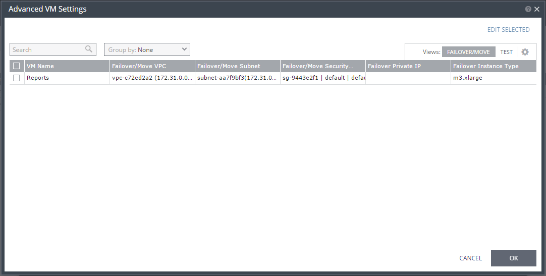 Displays the recovery settings for the virtual machines in the VPG. By default, the recovery settings for failover and move are displayed. You can display the recovery settings for failover tests by selecting TEST. You can choose to edit information in one field by clicking the field and updating the information. You can choose to edit information for several virtual machines at the same time by selecting the virtual machines and clicking EDIT SELECTED.