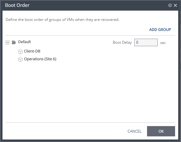 Initially, virtual machines in the VPG are displayed together under the default group. If you want specific machines to start before other virtual machines, define new groups with one or more virtual machines in each group.