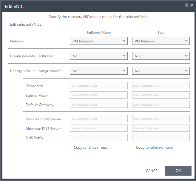 ■ Copy to failover/move: Select this to copy the settings in the Test column to the Failover/Move column.