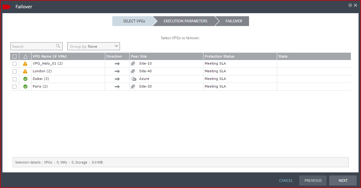 2. Select the VPGs to failover. By default, all VPGs are listed.