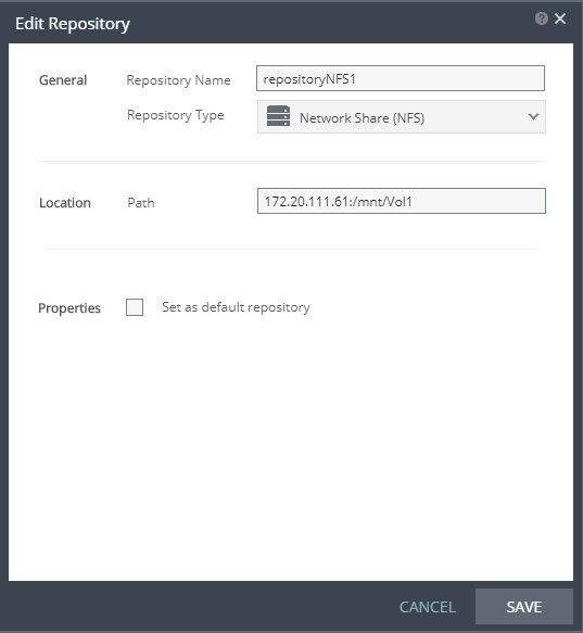 ■ Repository Type: This field is not available for editing. Path: This field is not available for editing. Set as default repository: Select to use the repository as the default when specifying extended recovery in a VPG.