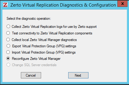 2. Select Reconfigure Zerto Manager and click Next