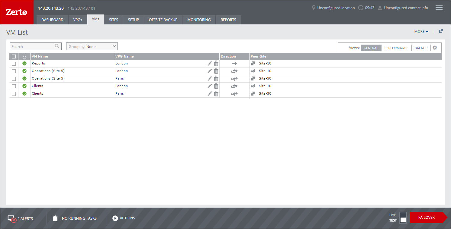 ■ Peer Site: The name of the site with which this site is paired: the site where the VPG is protected or will be recovered to.